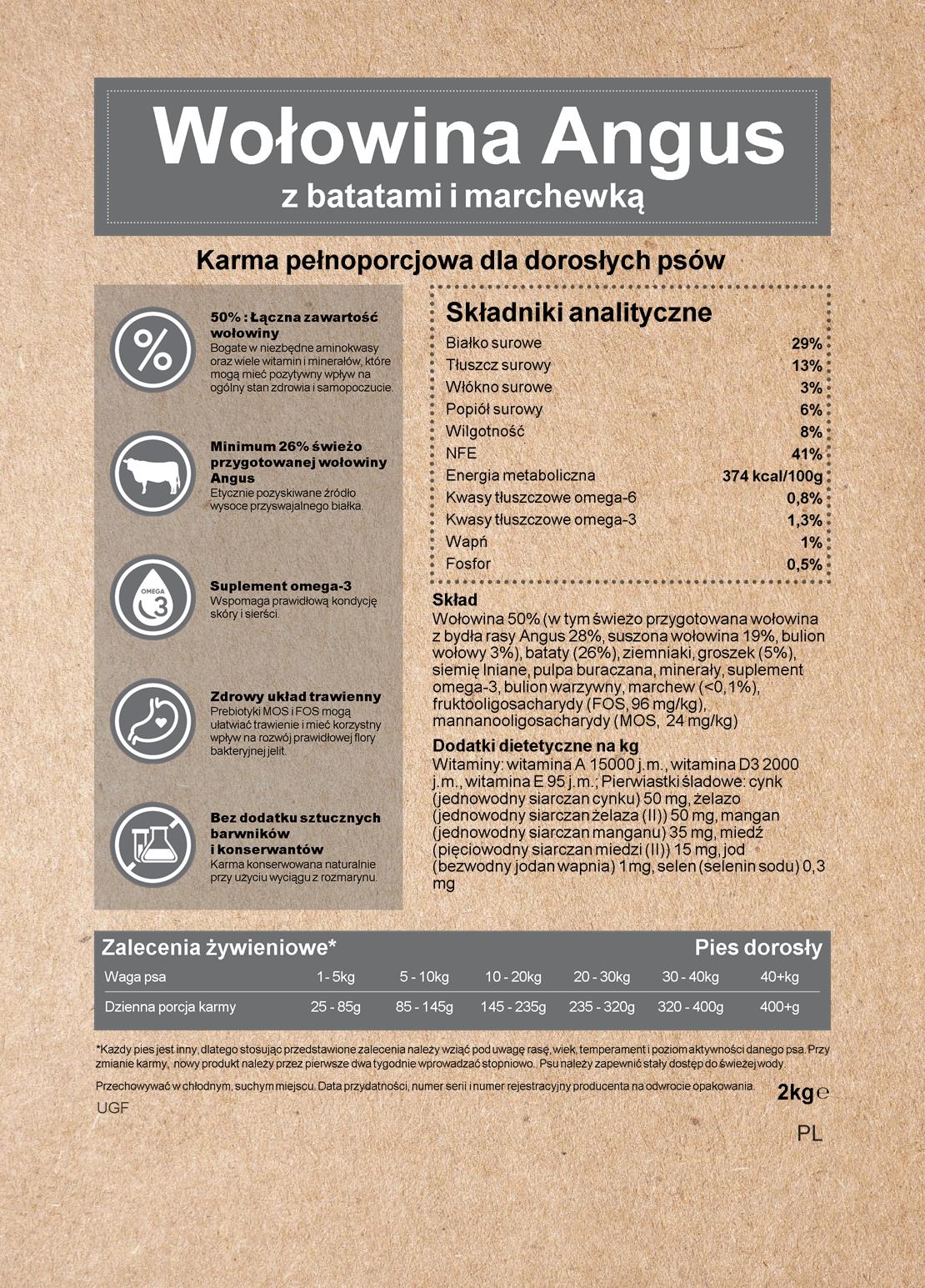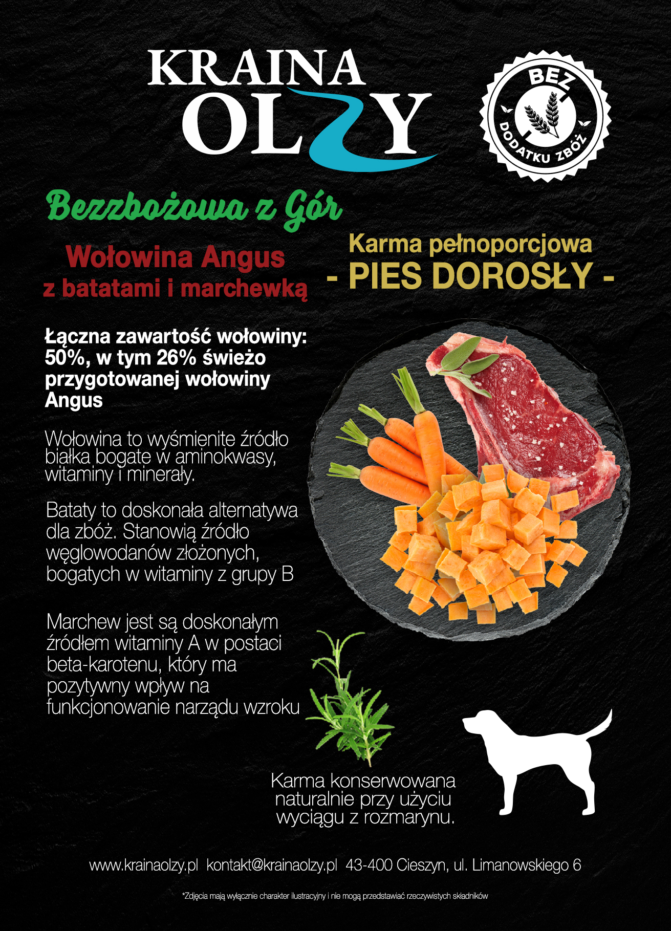 rasy Angus 28%, suszona wołowina 19%, bulion wołowy 3%), bataty
